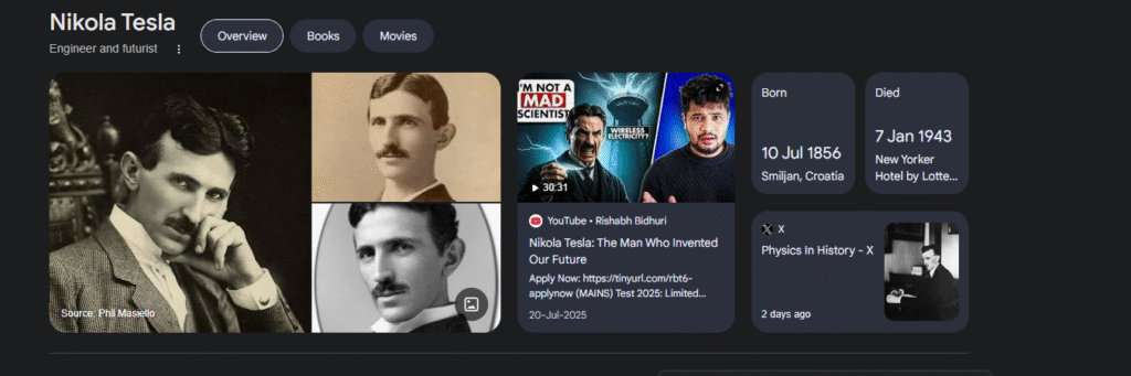 For example, when you search for “Nikola Tesla,” you will see an information box that lists its founder, headquarters, website, and stock symbol. That is the Knowledge Panel at work.
