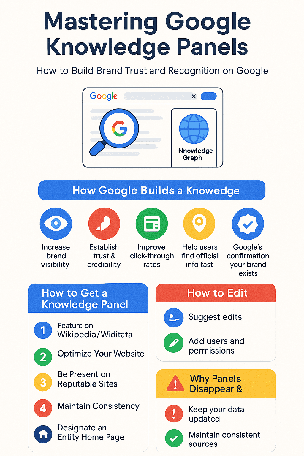 Knowledge Panels cannot be bought or manually created. Google’s process is automated and relies on trust signals, so manipulative tactics or fake references rarely work.